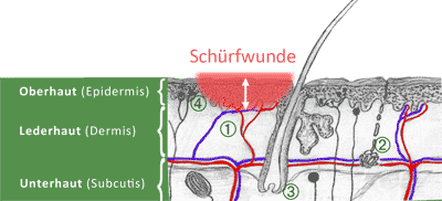 Bei Schürfwunden (Abschürfungen, Fachausdrücke: Erosion, Exfoliation, Exkoriation) ist nur die oberste Hautschicht (Oberhaut, Fachausdruck: Epidermis, Abb.1) verletzt. Schürfwunden passieren schnell, sind aber in der Regel harmlos und verheilen ohne Narbenbildung. Aber auch kleinste Schürfwunden können eine Eintrittspforte für Krankheitserreger sein.
